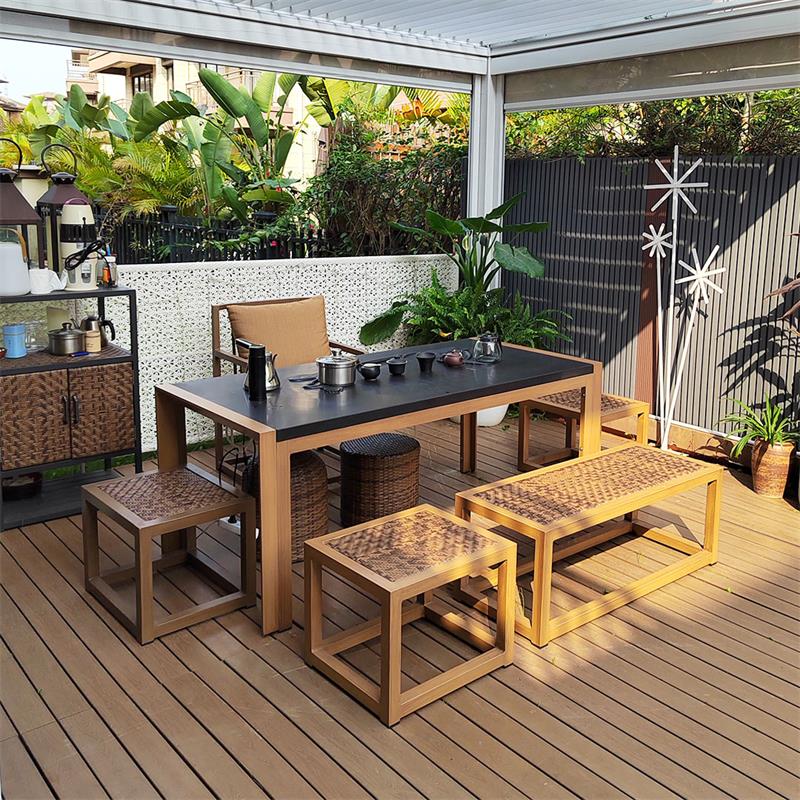 該系列產品主要以仿木鋁合金輔以部分仿藤和當前時尚流行的包芯真空帶搭配,配以時尚布藝元素,云夢椅、云夢亭、“道德經、蓮年如意”硯石茶臺,茶余飯后,休閑生活新方式,帶給消費者不一樣的休閑生活體驗。