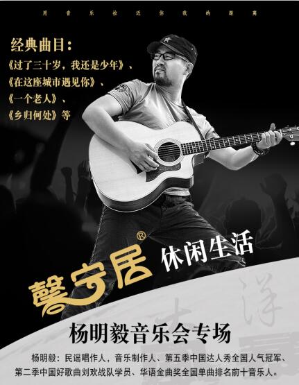 2018/10/24,在深圳馨寧居休閑生活展廳舉辦一場楊明毅音樂會專場。楊明毅因一首濃郁中原風的歌曲《一位老人》走進觀眾視野,被大家所熟知,獨特的歌曲風格,粗獷的外表,好像是鄰家大叔在用當地的方言來給你講故事。令人澎湃!